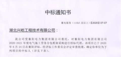 2020年7月6日,湖北興屹工程技術有限公司參與襄陽電力集團有限公司組織的20